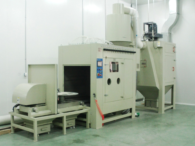 工作方式:產(chǎn)品自動(dòng)進(jìn)出,自動(dòng)旋轉(zhuǎn),自動(dòng)噴砂